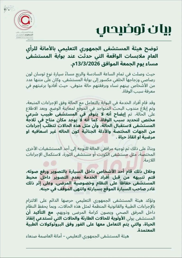 بيان_توضيحي للرأي العام صادر عن هيئة المستشفى الجمهوري التعليمي أمانة العاصمة حول ملابسات الواقعة التي حدثت عند بوابة المستشفى مساء يوم الجمعة الموافق 13/3/2026م. حيث