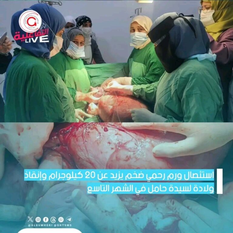 استئصال ورم رحمي ضخم يزيد عن 20 كيلوجرام وإنقاذ ولادة لسيدة حامل في الشهر التاسع تم اليوم في هيئة المستشفى الجمهوري بصنعاء، بحمد الله إجراء